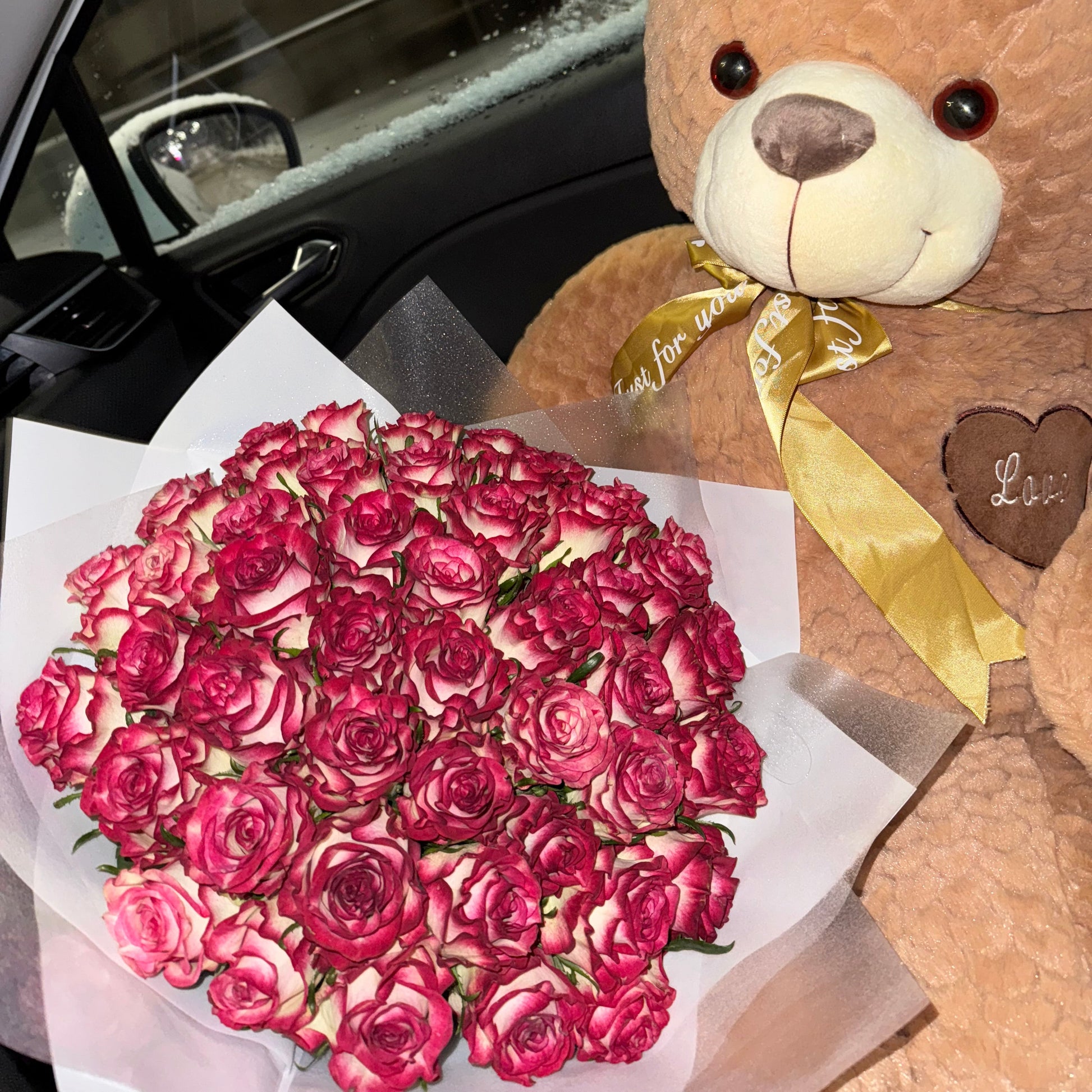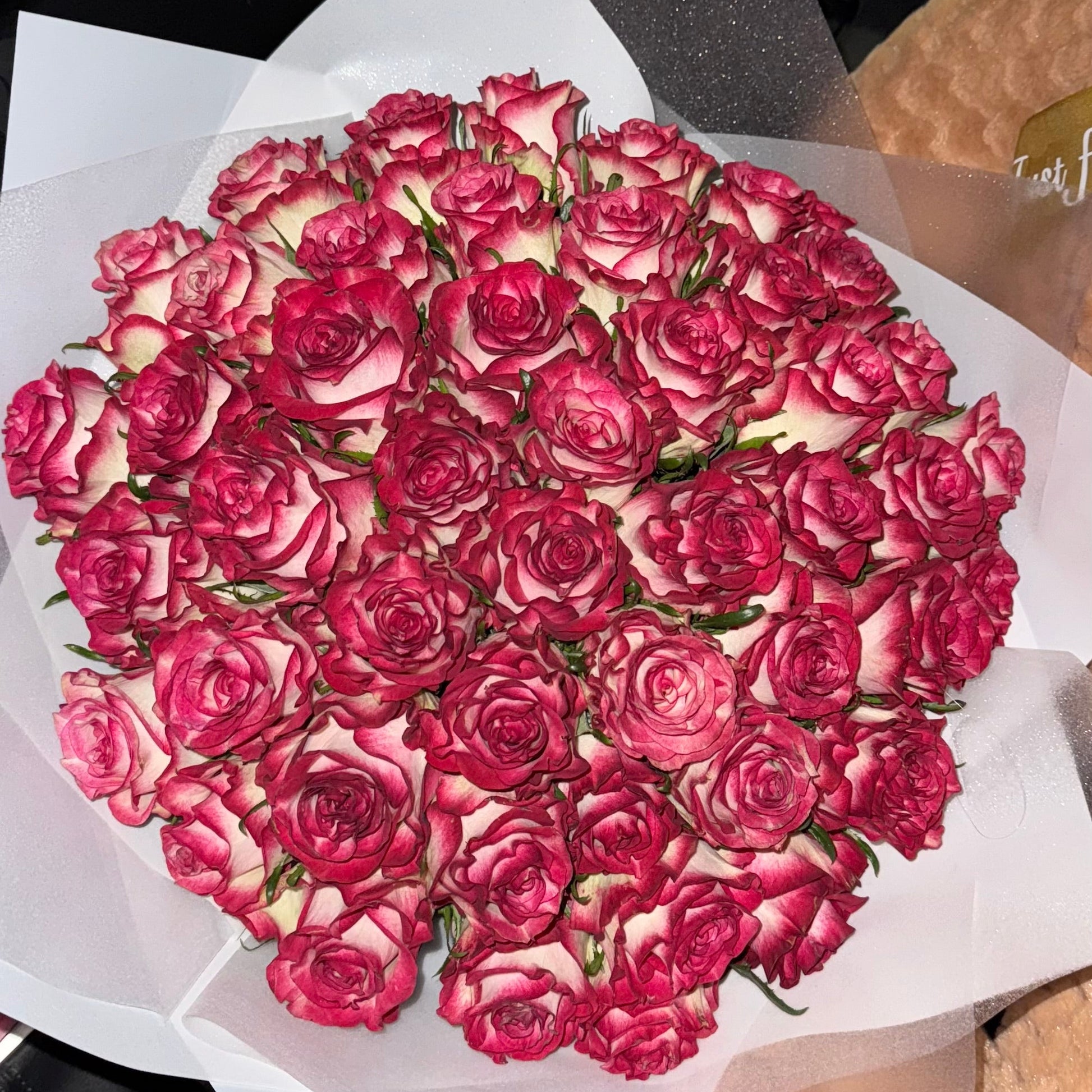 A statement of romance and elegance, this bouquet features 51 exquisite Candy Roses, celebrated for their soft blush centers and deep pink edges. Each rose is carefully selected and arranged to create a full, rounded composition that feels both luxurious and emotionally powerful.