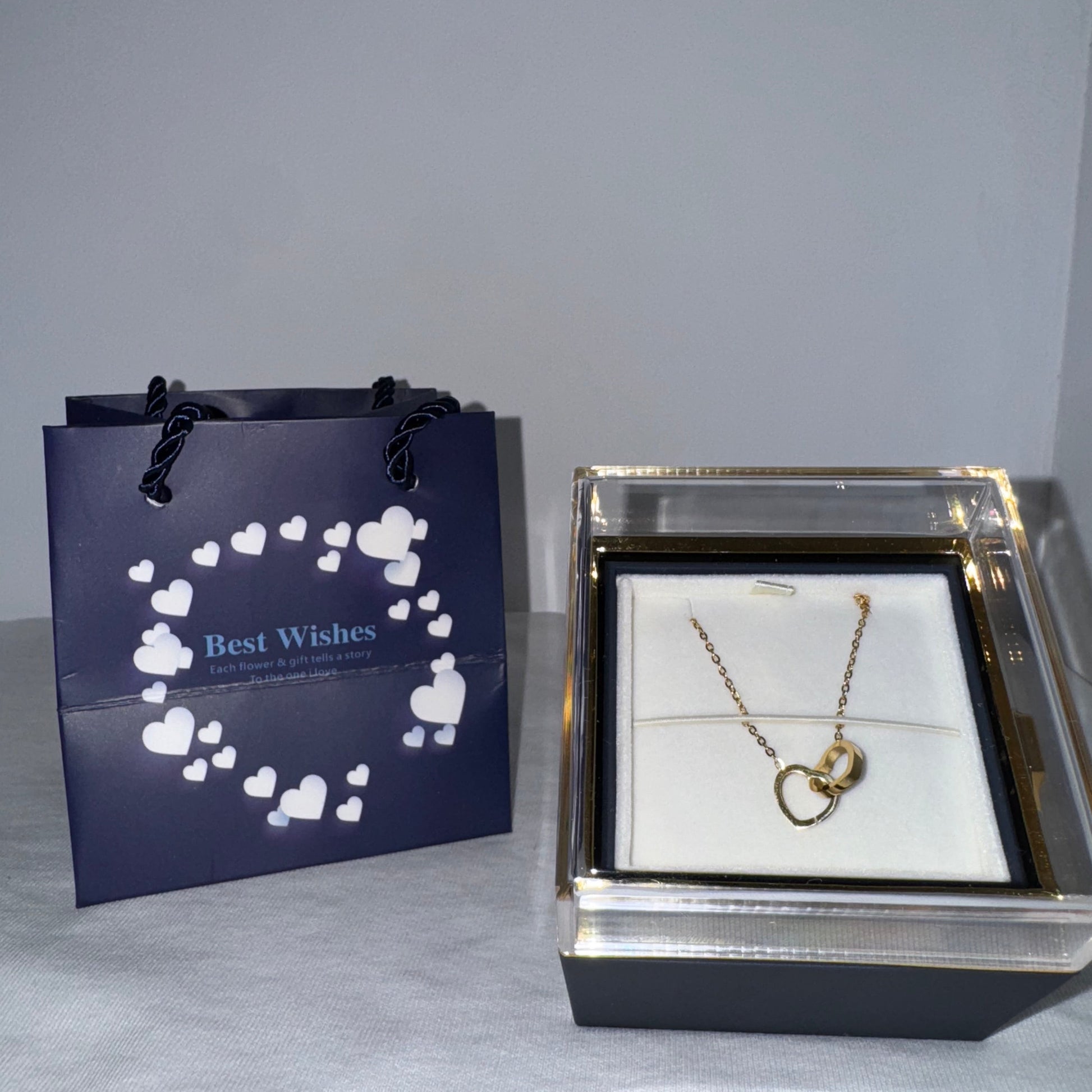 A charming teddy bear designed to hold more than a gift — it holds a heartfelt message. At its center rests a delicate necklace with intertwined heart shapes, symbolizing connection, love, and unity. Presented in an elegant box, this piece blends tenderness and sophistication, making it a meaningful keepsake that speaks softly but deeply.