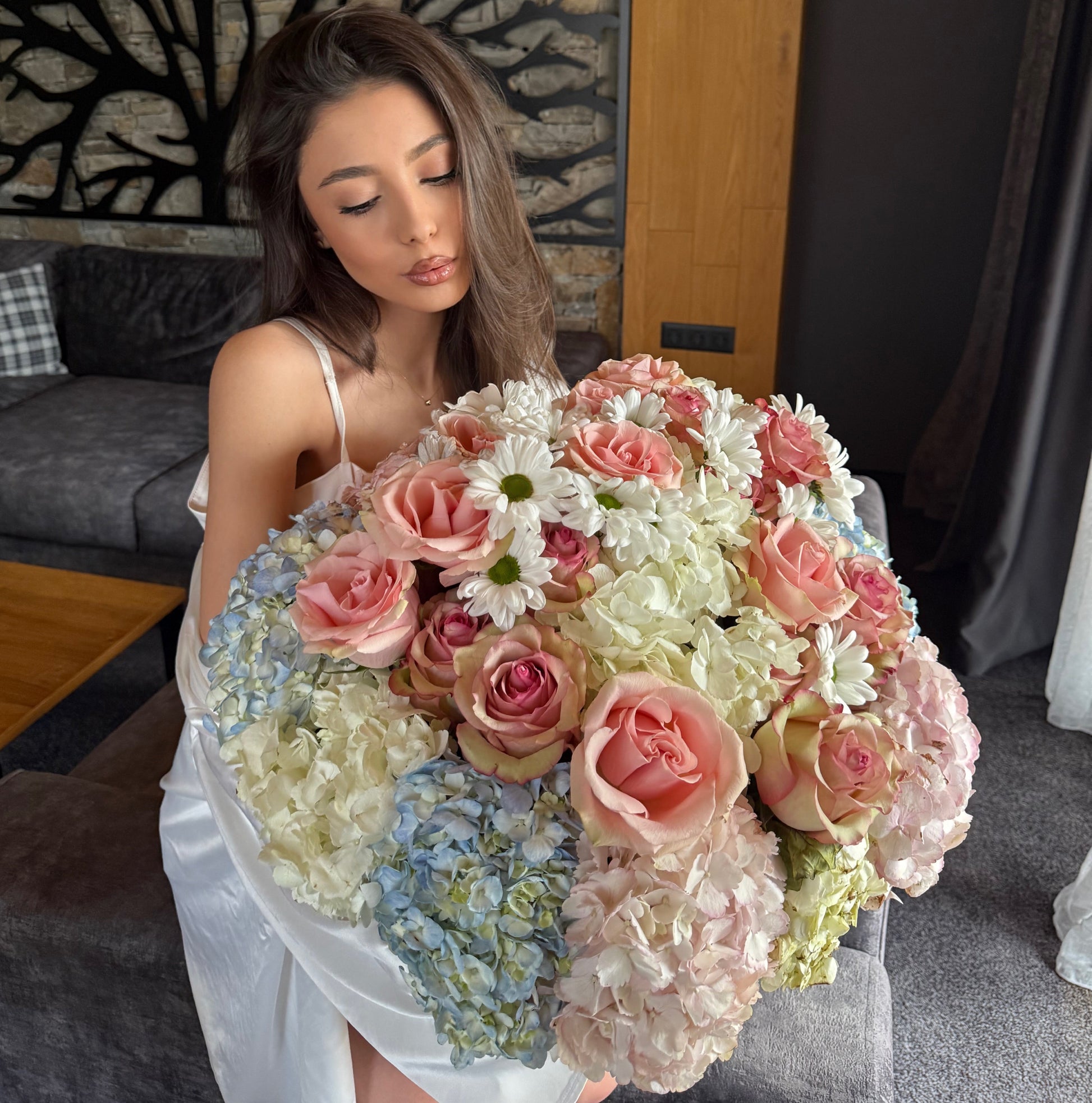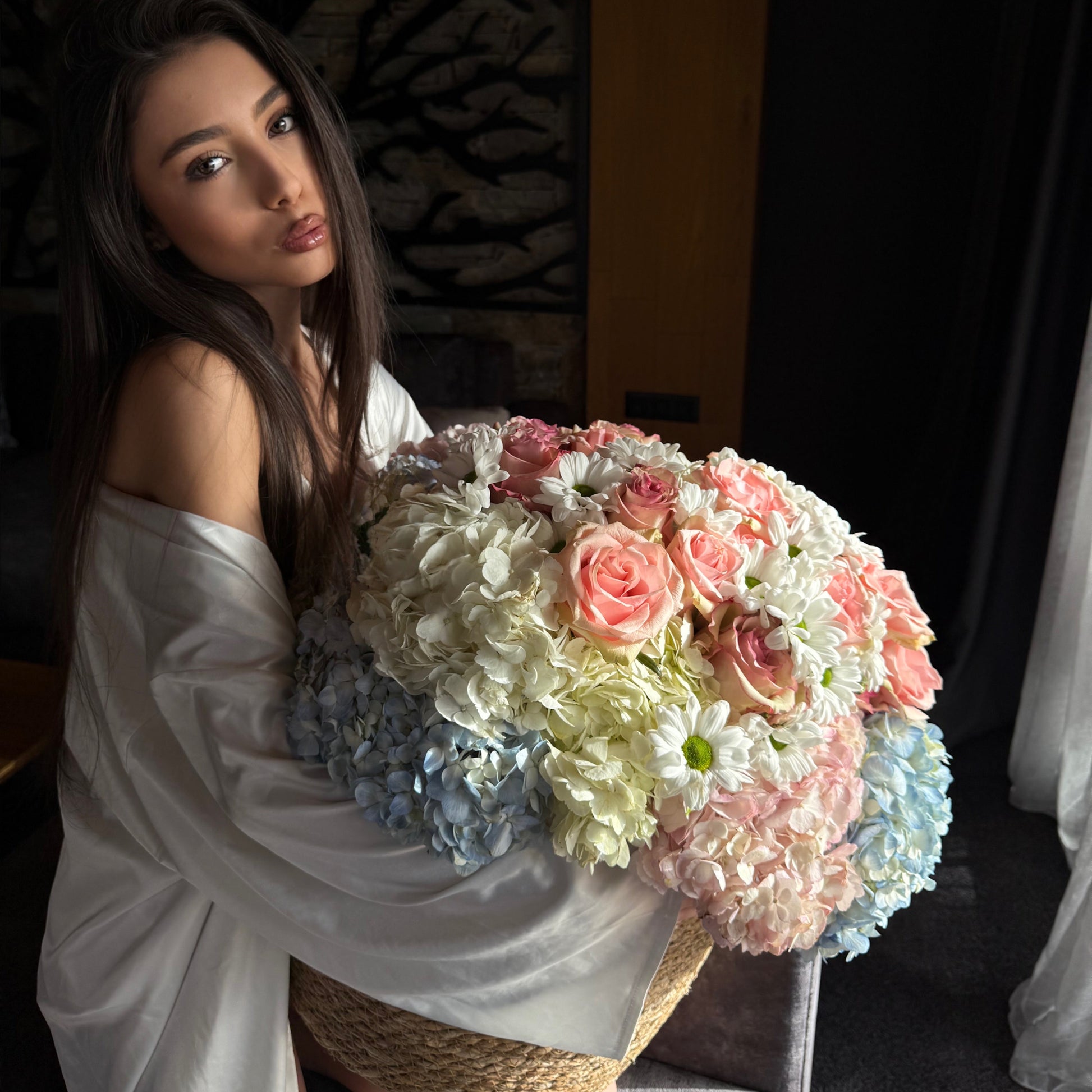 Мека и елегантна кошница с пастелни рози, хортензии и сезонни бели цветя. Създадена за моменти, които заслужават нежна красота и вечна свежест.